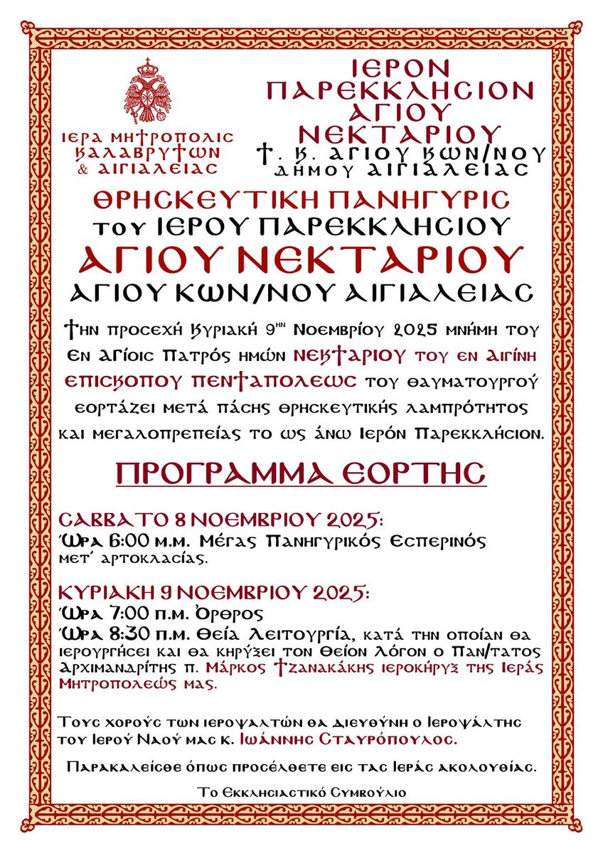 Θρησκευτική Πανήγυρη Ιερού Παρεκκλησίου Αγίου Νεκταρίου Αγίου Κων/νου Αιγιαλείας