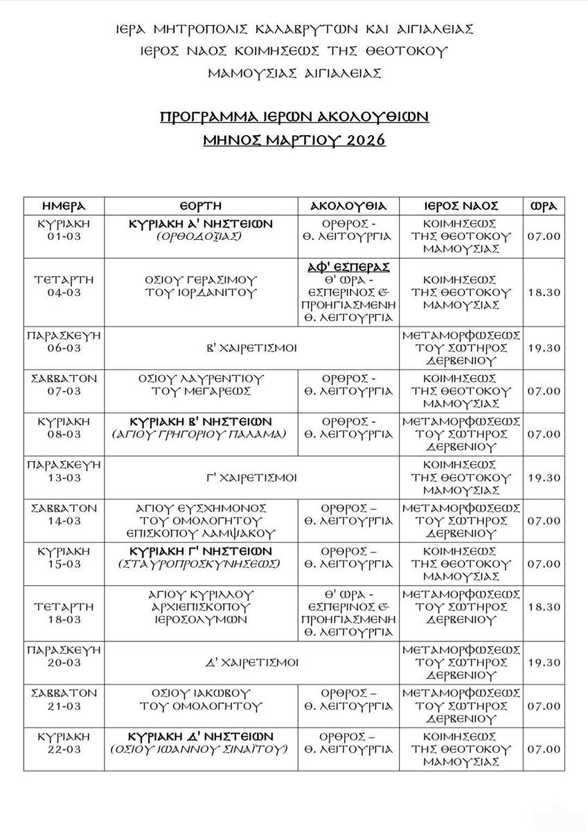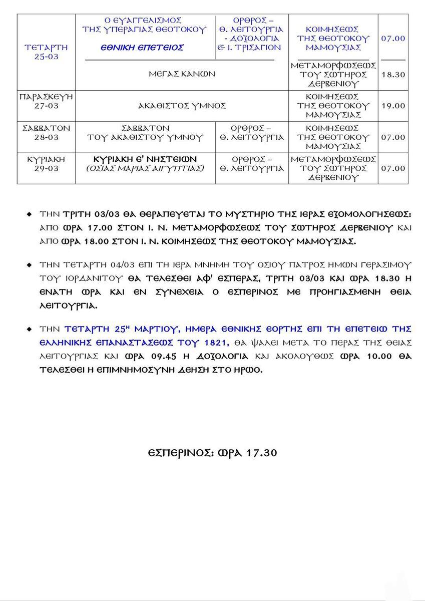 Ι.Ν.Κοιμήσεως Θεοτόκου Μαμουσιάς - Πρόγραμμα Ιερών Ακολουθιών Μαρτίου