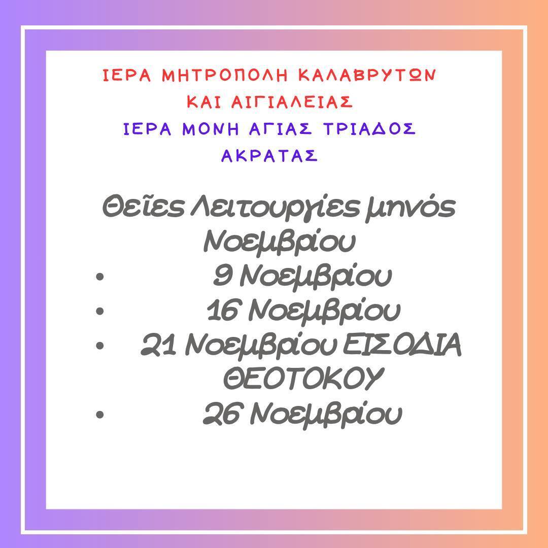 Ιερά Μονή Αγίας Τριάδος Ακράτας: Θείες Λειτουργίες μηνός Νοεμβρίου