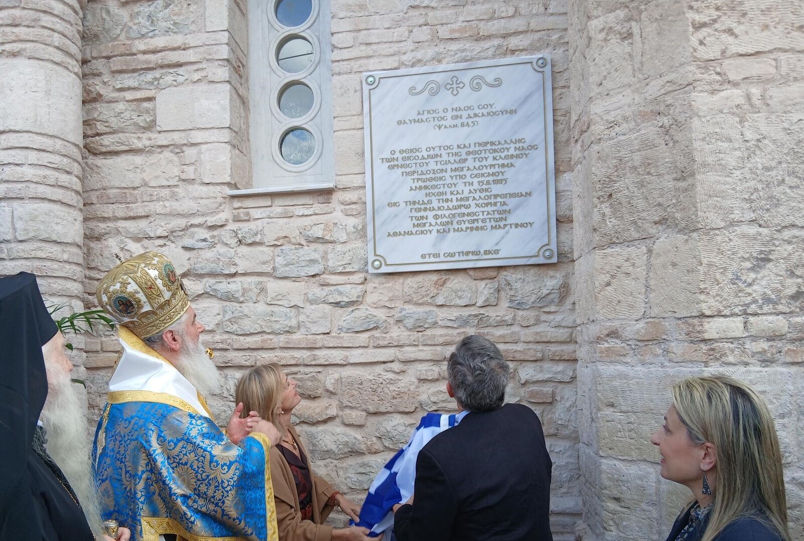 Μετά τη Θεία Λειτουργία τελέστηκαν και τα αποκαλυπτήρια της μαρμάρινης επιγραφής του Ιερού Ναού, η οποία φιλοτεχνήθηκε προς διαρκή ανάμνηση της ανακαινίσεως και της ιστορικής επαναλειτουργίας του. Ο Σεβασμιώτατος Μητροπολίτης κ. Ιερώνυμος εξήρε την αφοσίωση, τη σεμνότητα και το μεγαλείο της προσφοράς του ζεύγους Μαρτίνου προς την Εκκλησία, τονίζοντας ότι τα ονόματά τους «θα μνημονεύονται εις τους αιώνας των αιώνων» ως υπόδειγμα χριστιανικής ανιδιοτέλειας και γενναιοδωρίας.